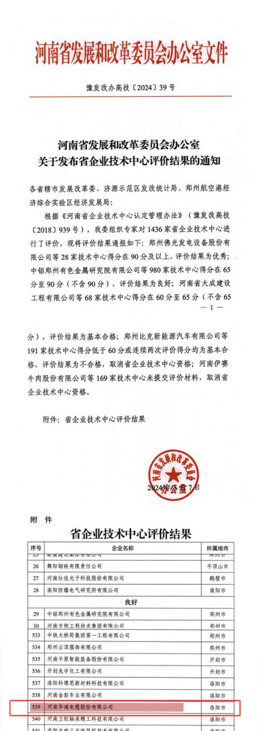 河南省發(fā)展和改革委員會辦公室發(fā)布了針對1436家省企業(yè)技術(shù)中心的評價結(jié)果通知,依據(jù)《河南省企業(yè)技術(shù)中心認(rèn)定管理辦法》(豫發(fā)改高技〔2018〕939號),結(jié)果顯示,我公司河南華通電纜股份有限公司評價結(jié)果為良好。